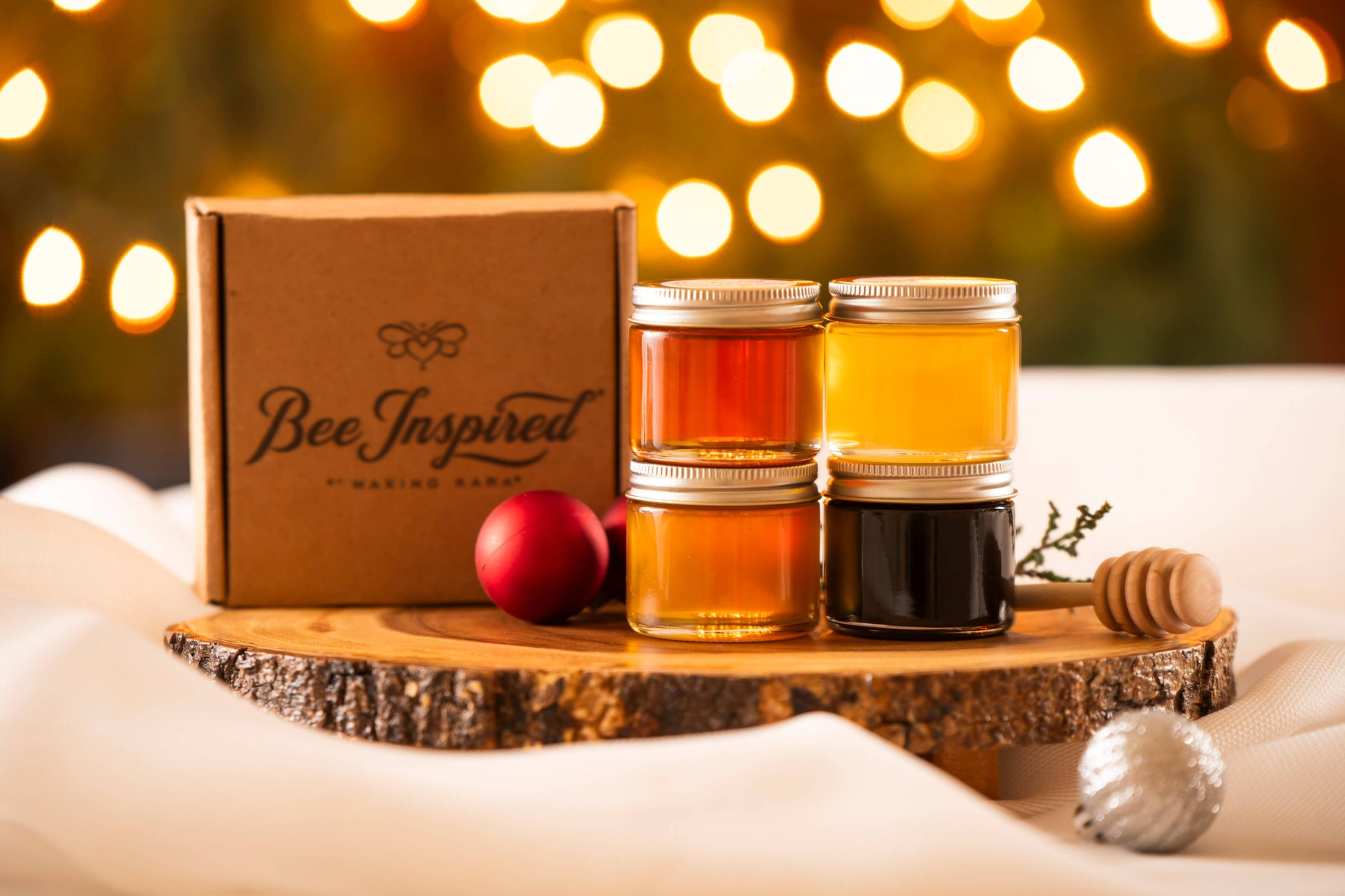 Each box includes four 2 oz jars of honey. Varietals may change depending on supply and may include Clover, Spring, Summer or Autumn Wildflower, Florida Orange Blossom, Blueberry Blossom, Sweet Clover, Buckwheat, and Avocado Blossom.