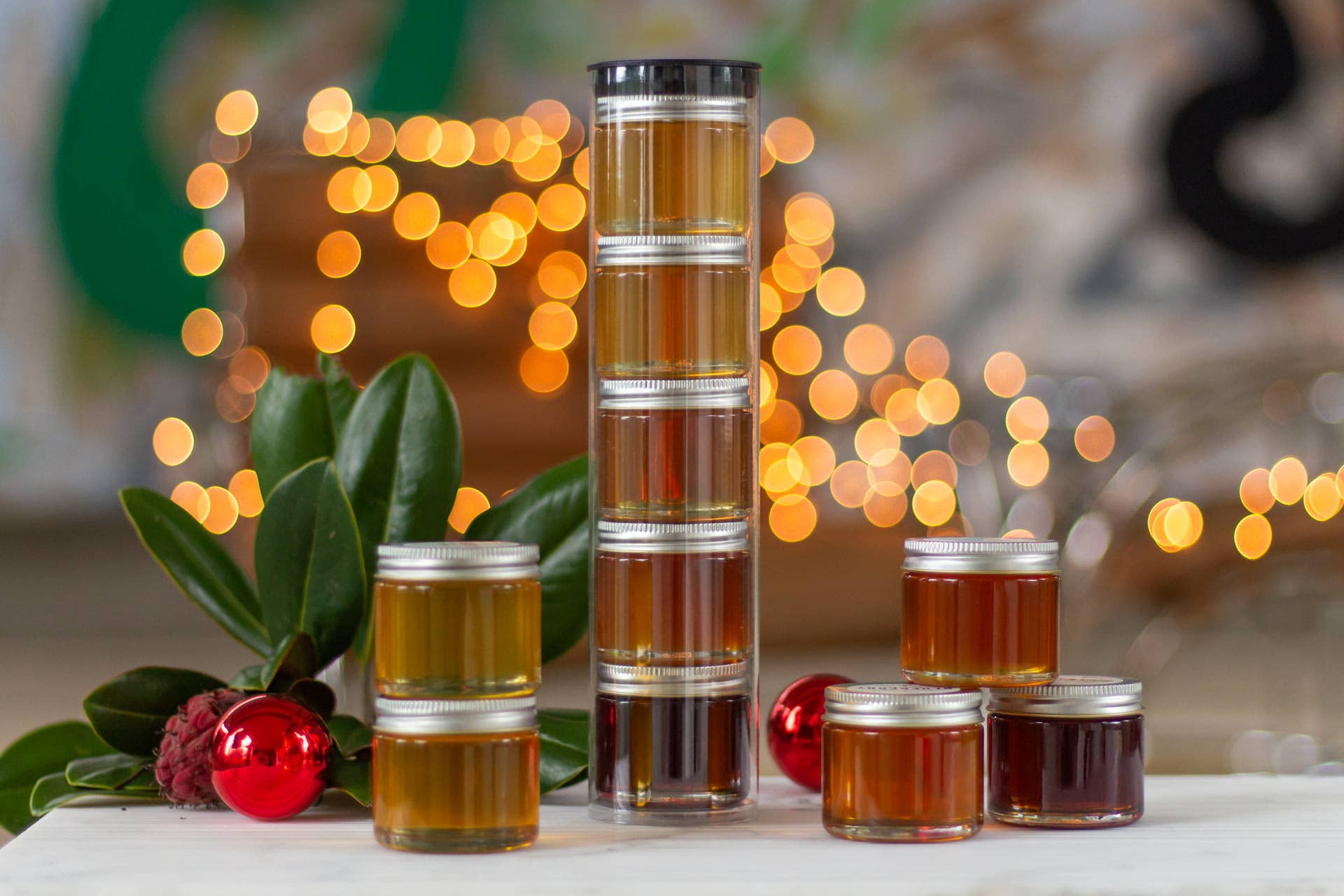 Each tower contains five 3oz jars of Honey. Varietals may include Clover, Blueberry Blossom, Sweet Clover, Wildflower, Orange Blossom, and Avocado Blossom.