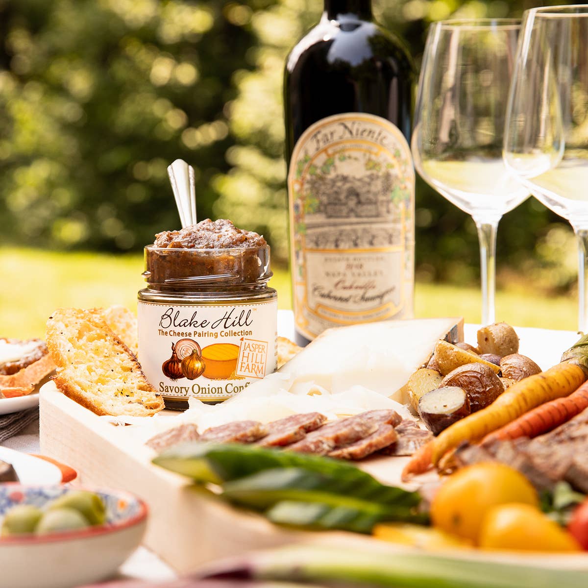 Onions are slow-simmered with mustard spice, apple cider vinegar, brown sugar, cracked black pepper, and sea salt for an incredibly versatile cheese pairing and pantry staple. Created with award-winning cheesemakers Jasper Hill Farm, this jam is designed to pair well with pungent Raclette-style cheese. Simply toss with roasted root vegetables for savory flavor, moistness and caramelization. Also perfect for topping a burger or adding extra zing to homemade Mac and Cheese! Check out our Cooking with Jam series for recipes like "Cheesy French Onion Tartiflette" and "French Onion, Tomato & Blue Cheese Quiche" - two of over 100 recipes showcasing how to make simple dishes special with a jar of Blake Hill jam!