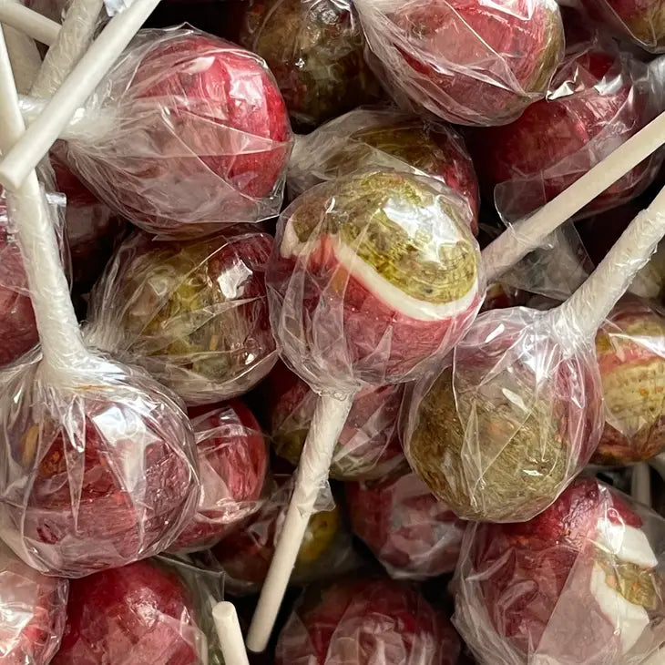 Divine Watermelon, Lip Smacking Mango, and Pineapple galore flavor lollipops with swirls of chili lime and sea salt throughout.