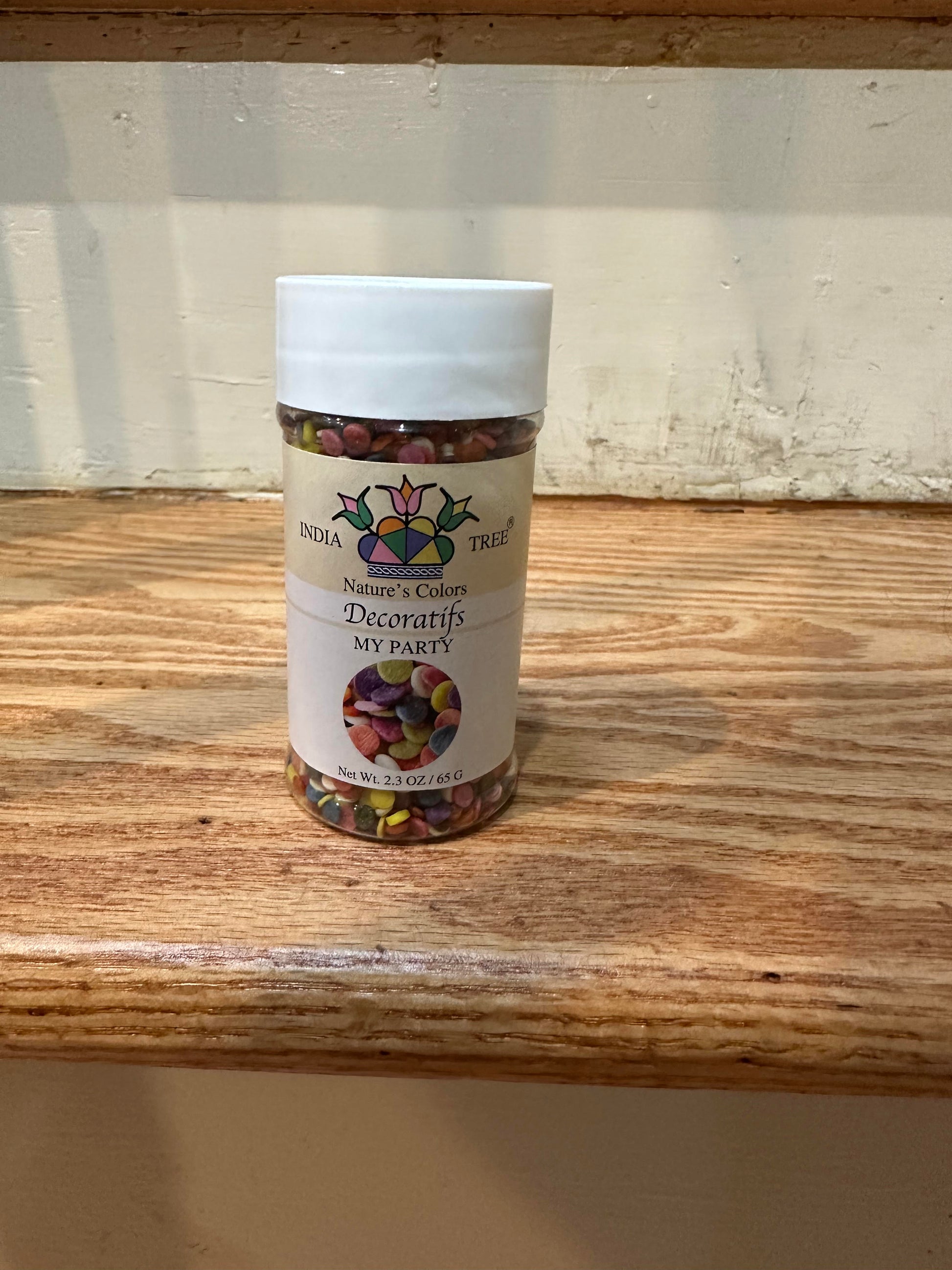 India Tree nature’s colors my party decoratifs are natural sprinkles colored only with plant-based dyes. These natural edible sequins contain no artificial ingredients, only vegetable colors. India tree nature’s colors decoratifs are colored with vegetable colorants. Use them to add magic to cookies, cakes, doughnuts, and other baked goods. Sprinkle them over ice cream and frozen desserts.