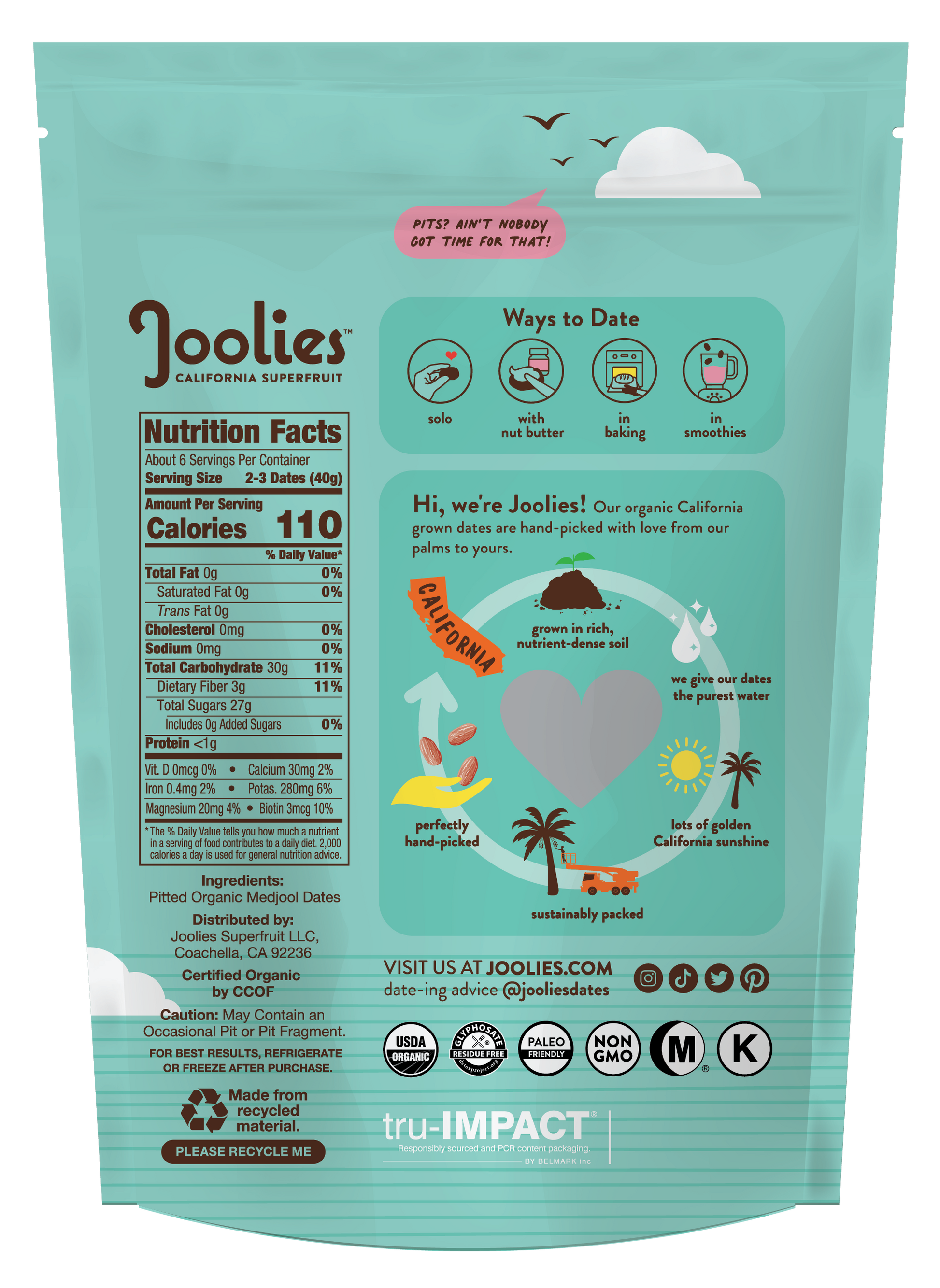 The result? A happy superfruit treat that your body and taste buds can finally agree on. Joolies juicy handpicked dates are naturally packed with Fiber, Magnesium and Potassium. Great for everyday snacking, mixing, sharing or gifting.