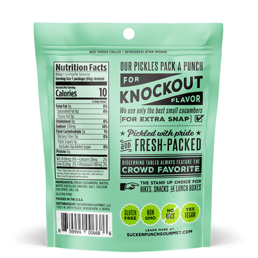 Looking for the perfect on-the-go, guilt-free snack? SuckerPunch Classic Dill Pickle Snack Packs are just what you need! These tasty pickle chips are gluten-free, certified kosher, non-GMO, and vegan. Plus, they have no high fructose corn syrup, so you can snack guilt-free. Our Classic Dill Pickle Snack Packs are made with our Signature Dill brine. Each pack is only 10 calories, making them a great choice for a healthy, flavorful snack. Whether you’re at school, work, watching the game or just out and about, SuckerPunch Classic Dill Pickle Snack Packs are easy to take with you. Enjoy a crisp, refreshing start with our classic dill taste in every bite. Try them today and experience the bold, all-natural flavor of SuckerPunch!